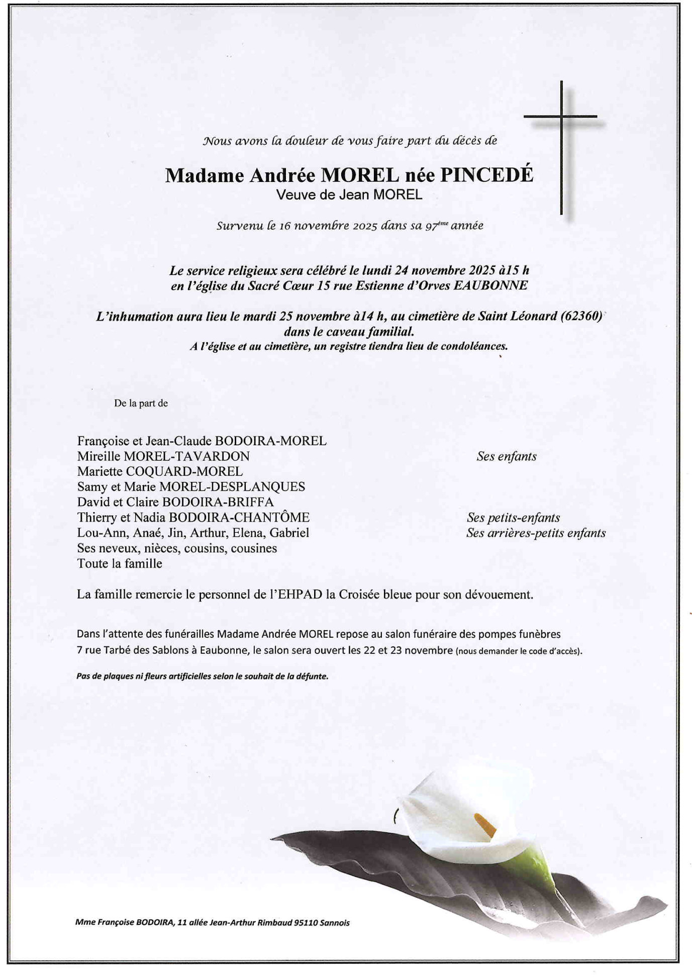 Décédée à Eaubonne (95600, France) le dimanche 16 novembre 2025 à l'âge de 96 ans