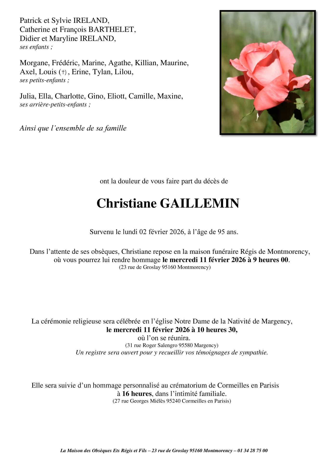 Décédée à Montmorency (95160, France) le lundi 2 février 2026 à l'âge de 95 ans