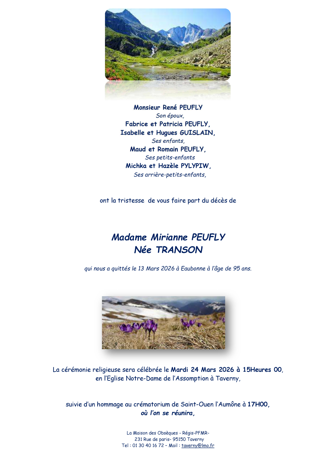 Décédée à Eaubonne (95600, France) le vendredi 13 mars 2026 à l'âge de 95 ans